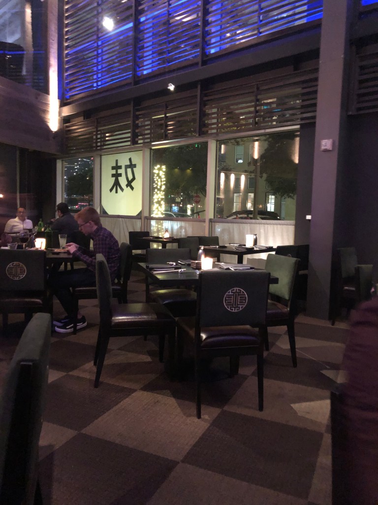 But first, let’s talk about the locale of Imoto. Imoto is located in downtown Dallas, Texas, and it is more specifically on Victory Park Ln. Victory Park houses the American Airlines Center – the home of the Dallas Mavericks, Dallas Stars and several concerts and events. So you can go watch Luka Doncic and the Mavs cross up their competition right after you get your fill of tasty food. But I digress haha; let’s have a dialogue about the interior and atmosphere of Imoto. Imoto is described as a ‘Chic-but-casual bi-level restaurant and lounge,’ so Imoto is a blend of casual style and formal flair. And I think they perfected this combo; the best way I can describe the feeling inside of Imoto is a laid-back elegance. For instance, they played upbeat, energetic songs while patrons drank outstanding sake and we had some authentic and savory sushi. They even have nightclub-esque lights shining on their origami ornaments on the ceiling. Imoto, by far, is a great dining experience in Dallas.