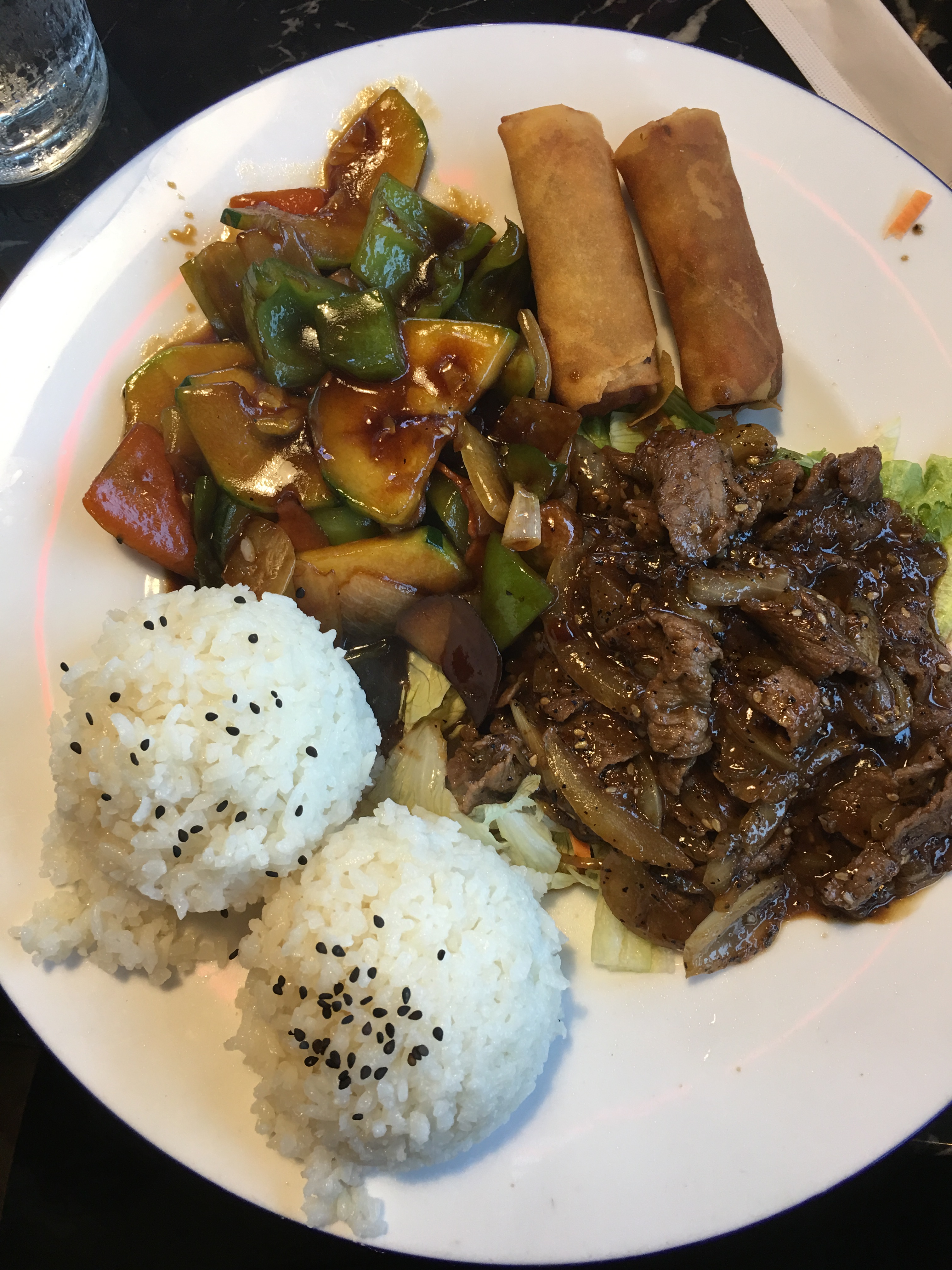 The rest of us ordered various dishes: I had the bulgogi rice plate, which was served with miso soup, side vegetables & egg rolls. And while I didn’t get to grill my own bulgogi, it was certainly delicious (and we had enough fun watching our friend cook hers).