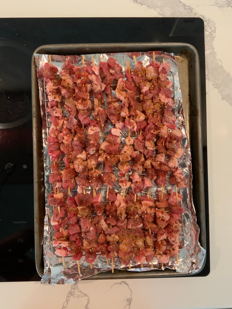 - On a baking sheet, add a wire cooling rack [this lets the excess fat drip down]. Place a row of filled skewers on the rack.