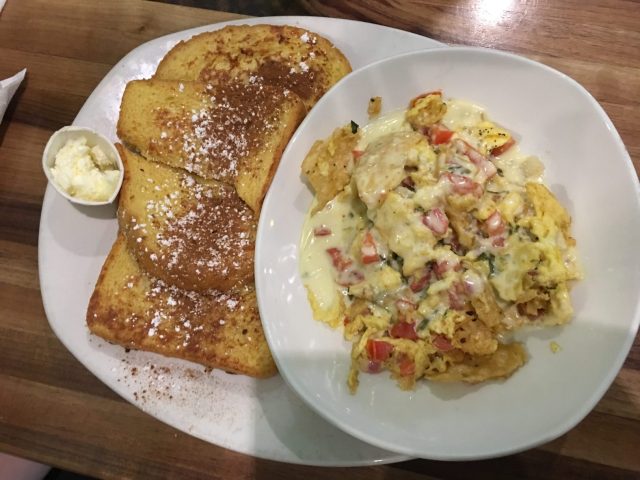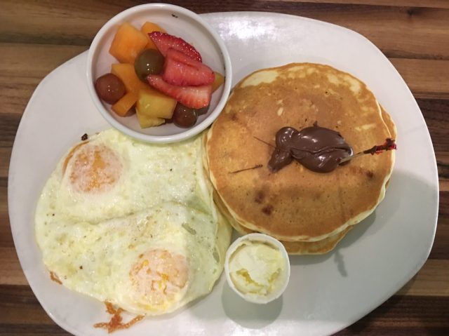 Kerbey’s always had a warm and welcome feel to it, and when we went, they even gave me a free pancake for my birthday! We ordered the Paris Texas Platter (French Toast & Migas, which consists of scrambled eggs, pico de gallo, tortilla chips, cheddarjack cheese), a full stack of lemon poppy seeds pancakes, and the Breakfast Platter, consisting of two eggs, two half size pancakes and a cup of fruit.